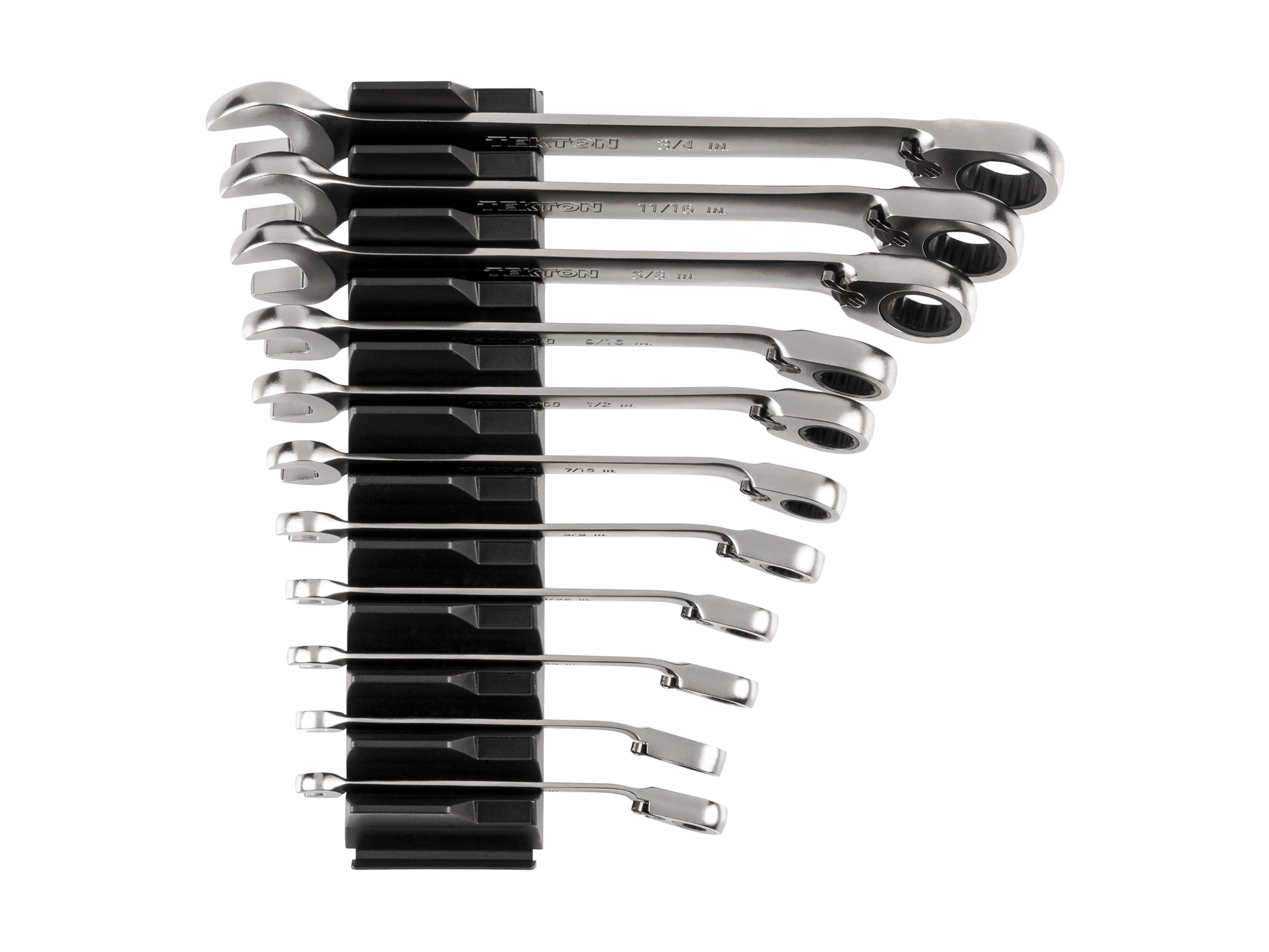Each Tekton reversible ratcheting combination wrench is permanently marked with both a high-visibility laser marking and a stamped marking for easy size identification. The 12-point box end fits multiple types of fasteners including 6-point, 12-point, and square. The 1/4, 9/32, 5/16, and 11/32 inch wrenches have 60-tooth ratcheting mechanisms, the rest have 72-tooth mechanisms. The 15-degree offset box end wrench geometry creates clearance for your fingers and makes it easier to reach around obstructions. The drive switch allows you to quickly switch ratcheting directions while you're working. The wrench is abrasive-blasted to create a finely textured finish and then plated with a trivalent chrome process, ensuring that the finish won't flake off or corrode over time. The set includes a modular wrench organizer that fits most toolbox drawers, keeping your ratcheting wrenches neatly arranged with consistent spacing.