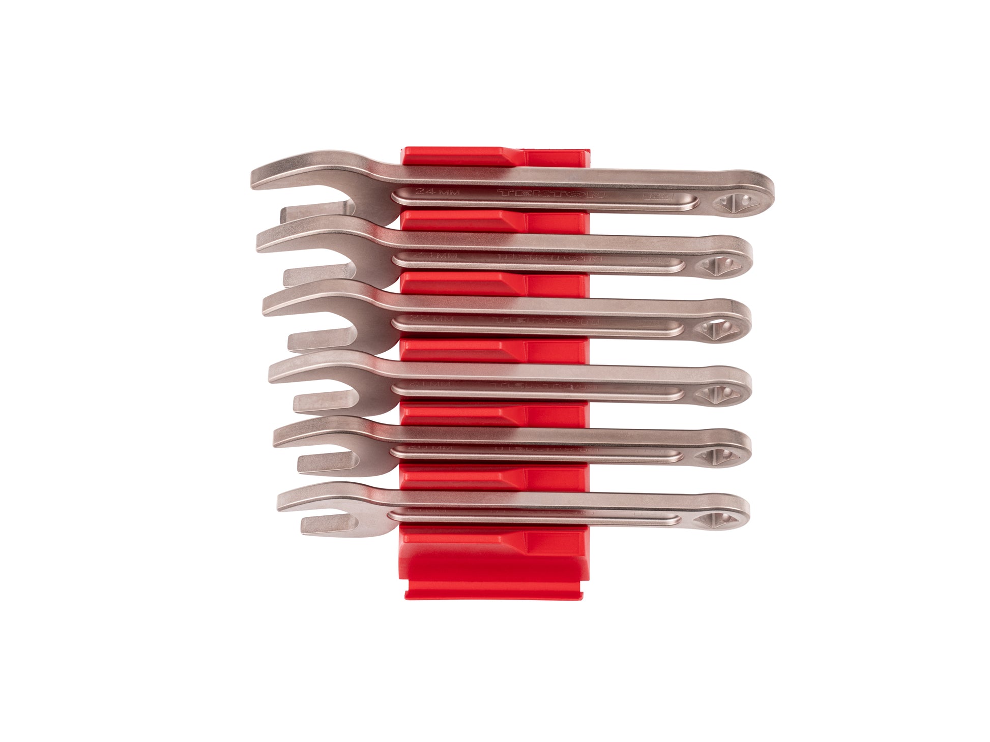 Tekton service wrenches are short-handled, open-end access wrenches with a 15-degree angled head on one side and a drive square on the other. They complement our other access wrenches, including crowfoot, flare nut crowfoot, and angle head wrenches. The drive square at the end of the handle adds versatility when paired with a ratchet or a torque wrench, and has detent grooves on all four sides. Wrench sizes with a 3/8 inch drive square include 3/4–1-1/2 inch and 19–38 mm. Wrench sizes with a 1/2 inch drive square include 1-9/16–2-5/8 inch and 41–50 mm. The center-to-center distance between the drive square and the hex opening is engraved on the handle for quick reference when using the service wrench as a torque adapter. The tip of each jaw has a 10-degree lead-in taper that helps align the wrench with the hex flats when visibility is limited. We make our service wrenches from 4140 chromium molybdenum steel and harden them to 50–53 HRC. The wrenches are abrasive-blasted to create a finely textured satin finish and then plated with corrosion-resistant nickel that is easy to wipe clean. Our service wrenches are made entirely in the USA with USA-sourced materials. Machining, broaching, engraving, vibration polishing, abrasive blasting, and plating take place at our Grand Rapids, Michigan, manufacturing facility. This set includes modular wrench organizers that keep your wrenches neatly arranged with consistent spacing.