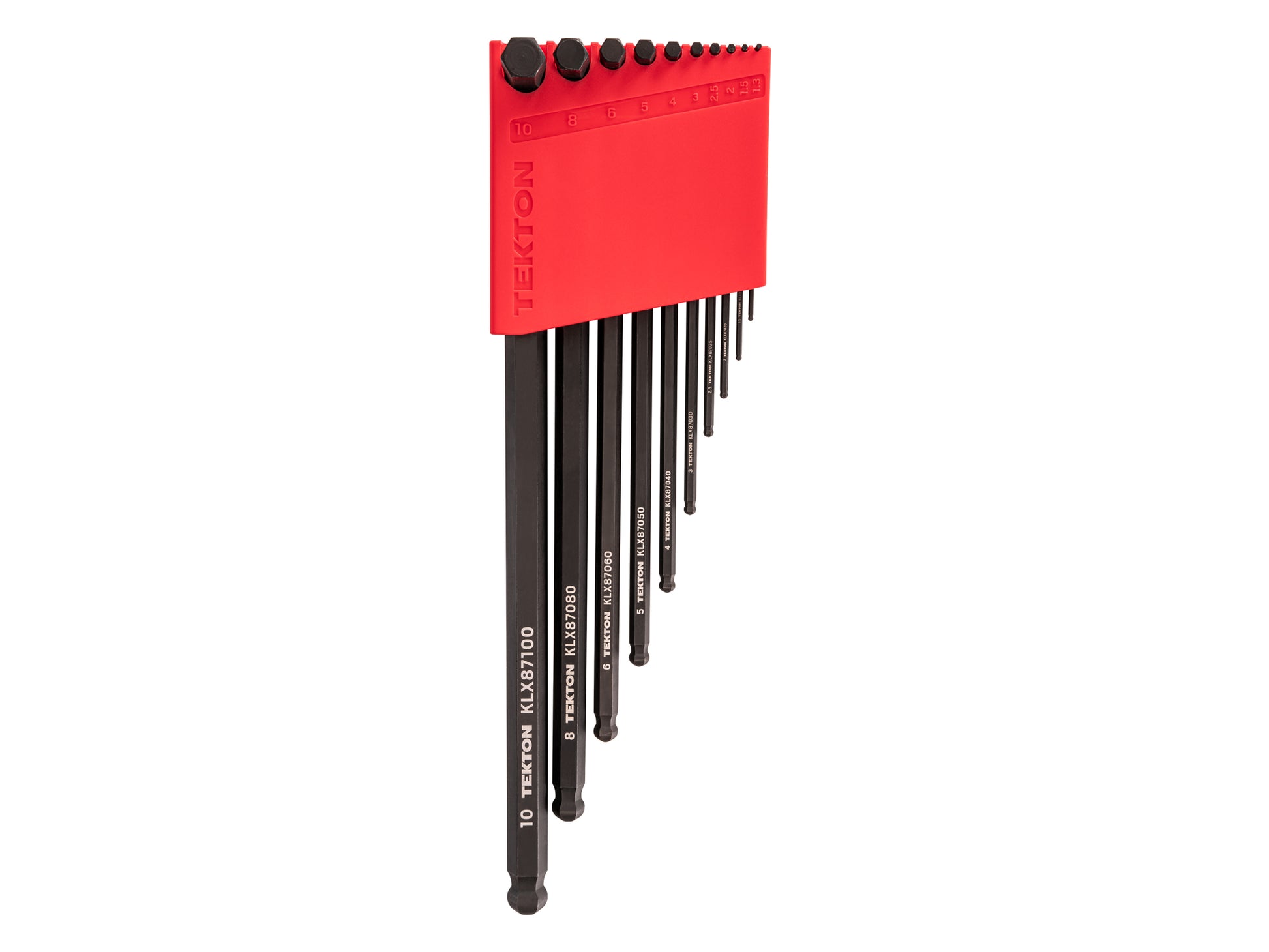 • Short Arm for Access – The L-key's short arm enables you to stay close to the fastener so that you can work in tighter spaces and with greater control • High Leverage – Our L-keys are longer in overall length compared to competitors, providing increased leverage where it matters • Tight Fit with Fasteners – We precisely manufacture our hex key geometry on the large end of the applicable range, resulting in less slop in fasteners • Quick-Access Holder – We designed our holder to organize the L-keys facing forward so you can easily access each tool without having to move others out of the way • 20-Degree Ball End – Our keys implement a steep ball end angle, which increases your ability to access fasteners while still maintaining sufficient strength • Markings and Finish – Each key is marked with a high-visibility size indicator that can't wear off and finished with a manganese phosphate coating that's highly resistant to corrosion