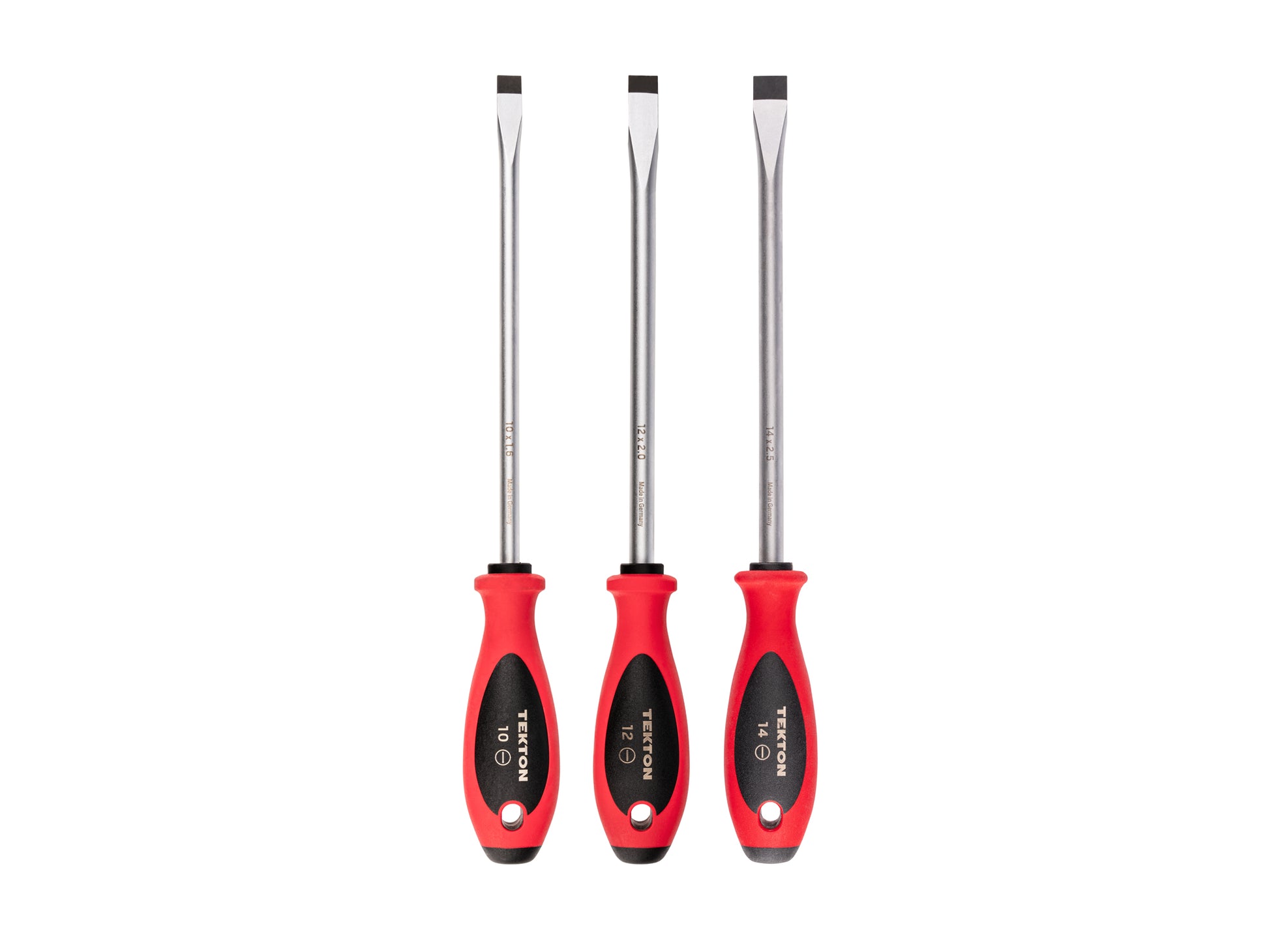 Tekton screwdrivers have handles that are designed for speed and torque. The front of the handle is round for quick turning and the middle transitions to a tri-lobe shape that provides a secure grip for high-torque driving. The handle’s red exterior is made of a lightly textured TPE material that is slightly soft and grippy for controlled spinning, fine adjustments, and reduced slipping under torque. Handle materials resist most common shop chemicals. Each driver has the tip size engraved in four locations with high-contrast laser markings. Each screwdriver handle has the same size through-hole so you can hang it on a hook. You can also attach a safety lanyard when working at heights to prevent drops. Tips are precisely machined and coated with black manganese phosphate, creating a slightly rough surface that enhances screw engagement. The conversion coating produces a uniform, corrosion-resistant layer that preserves tip geometry and doesn’t chip or flake off. The end of the shank is flattened to form a broad surface that resists twisting inside the handle. The handle is molded around the shank, creating a solid connection that is stronger and straighter than simply pressing the shank into a premade handle. This set includes slotted drivers with modular driver organizers.