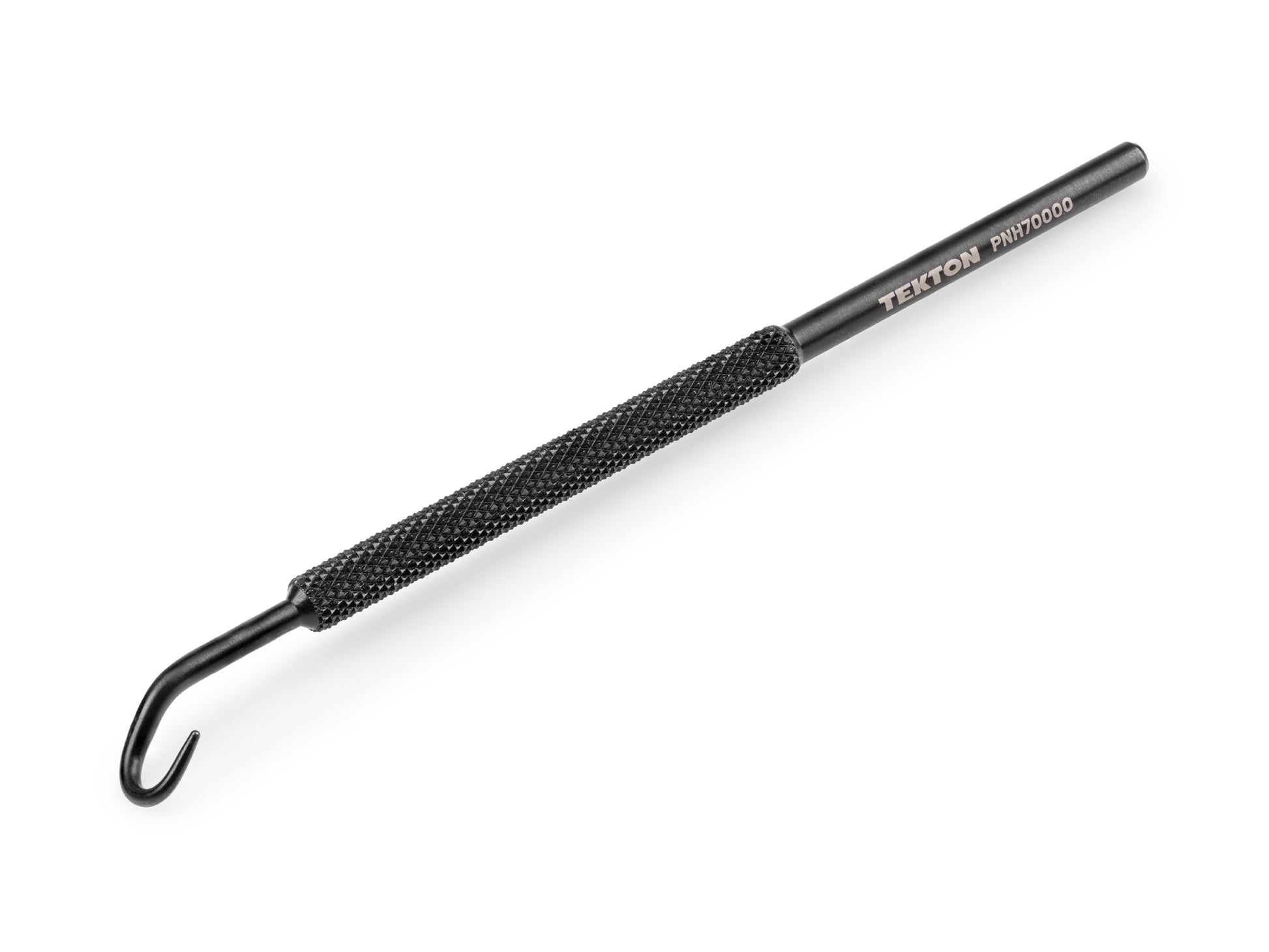 The Tekton Socket Retaining Pin and Ring Removal Tool is a dual-sided tool with a hook on one end and a punch on the other. Use the retaining ring hook to comfortably hook a socket retaining ring and pull it out of the ring groove. The hook has two bends: a 42-degree bend closer to the shaft of the tool, and a 180-degree bend towards the tip. The blunt tip of the hook prevents damage to the ring. Use the retaining pin punch to depress a detent pin or push out a retaining pin. The punch is long enough to reach all the way through our largest 3/4 inch drive impact socket base. It has a chamfered tip and high-contrast laser markings. There is a deep knurled grip in the middle of the tool. The tool is precisely machined from a solid piece of 8650 alloy steel and is finished with a black oxide coating for corrosion resistance. The Socket Retaining Pin and Ring Removal Tool is made entirely at our Grand Rapids, Michigan, manufacturing facility with USA-sourced materials.