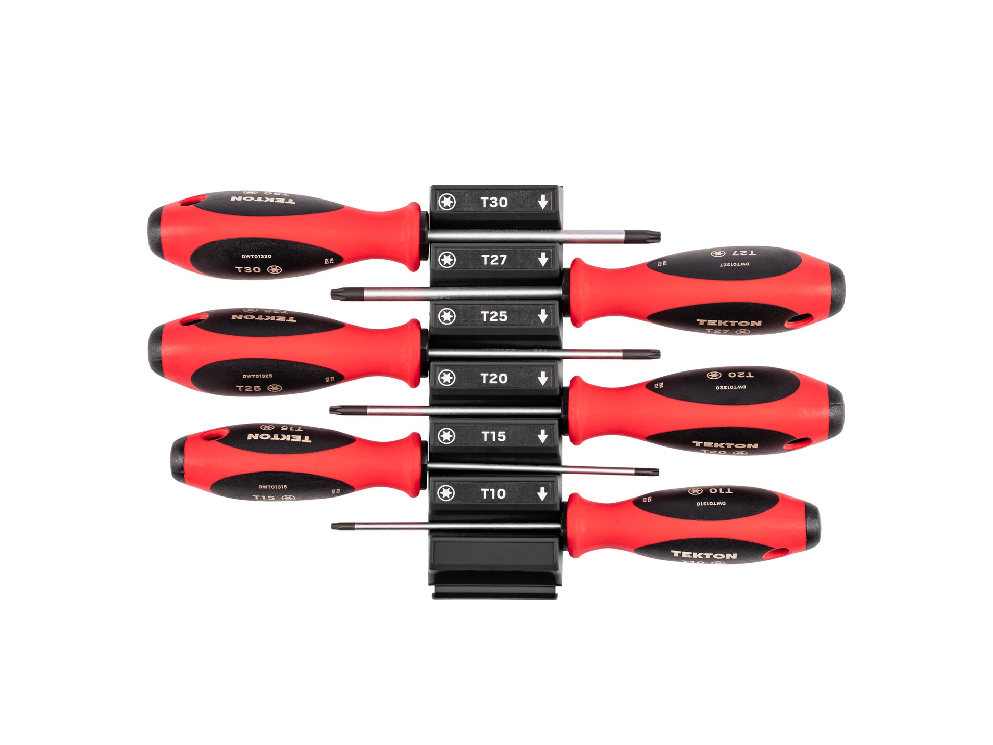 Tekton screwdrivers have handles that are designed for speed and torque. The front of the handle is round for quick turning and the middle transitions to a tri-lobe shape that provides a secure grip for high-torque driving. The handle’s red exterior is made of a lightly textured TPE material that is slightly soft and grippy for controlled spinning, fine adjustments, and reduced slipping under torque. Handle materials resist most common shop chemicals. Each driver has the tip size engraved in four locations with high-contrast laser markings. Each screwdriver handle has the same size through-hole so you can hang it on a hook. You can also attach a safety lanyard when working at heights to prevent drops. Tips are precisely machined and coated with black manganese phosphate, creating a slightly rough surface that enhances screw engagement. The conversion coating produces a uniform, corrosion-resistant layer that preserves tip geometry and doesn’t chip or flake off. The end of the shank is flattened to form a broad surface that resists twisting inside the handle. The handle is molded around the shank, creating a solid connection that is stronger and straighter than simply pressing the shank into a premade handle. Our Torx tips are precisely machined to fit the six-point star pattern of Torx screws, with a slightly shorter overall tip length for additional strength. This set includes modular driver organizers.